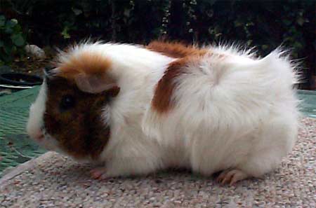 Guinea Pigs: These small rodents are great pets. They are 7-10" long when full grown and weigh about 1-1.25 pounds. They eat guinea pig pellets, fruits and vegetables, and drink water. They do not manufacture their own vitamin C, and therefore require supplements. They sometimes make a high-pitched whistling noise when they are excited. Short haired breeds are: Abyssinian, Peruvian & Teddys. Long haired breeds are: Peruvian, Texel and Silkie. See our guinea pig page for care and photos. They are available in a wide variety of colors.